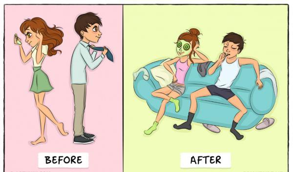 Prima del matrimonio entrambi passano tanto tempo per il look e per incontrare il partner, dopo il matrimonio, si va in giro in mutande e calzini e lei non ha problemi a farsi vedere mentre si prepara.