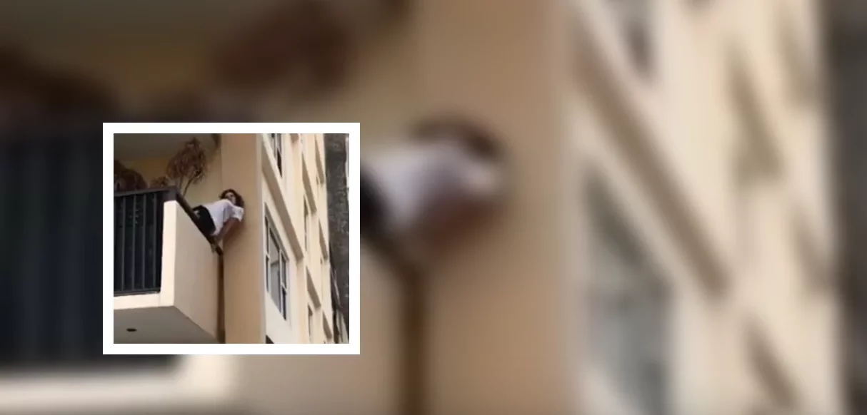 Il video è stato pubblicato su Youtube e dura poco più di tre minuti, mostra la donna in abiti casalinghi mentre si arrampica sul davanzale del balcone di casa al quarto piano, rischiando di cadere giù.