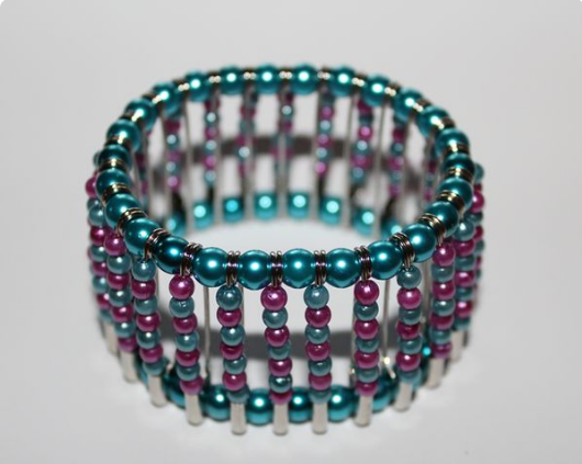 Tagliamo due pezzi di filo elastico che siano lunghi abbastanza per coprire la circonferenza del vostro polso e facciamo un nodo alla fine, inseriamo poi nei due fili ogni spilla e assicuriamoci che le perline siano posizione sempre nella stessa direzione.