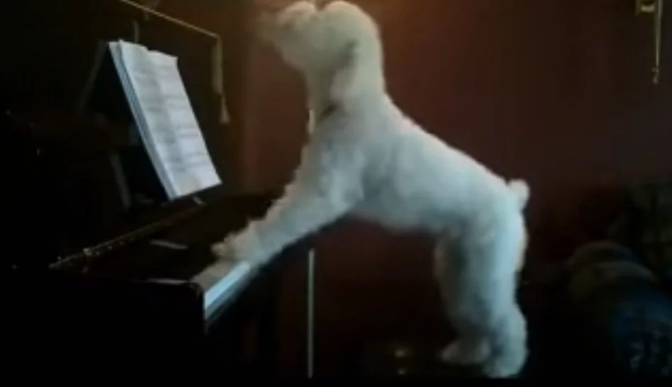 Improvvisamente, la telecamera mostra il suo cagnolino domestico si avvicina al pianoforte, e con le zampette toccò i tasti ed iniziò ad ululare.