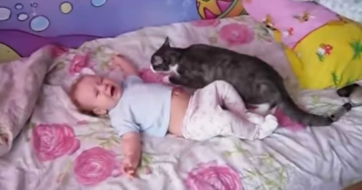 Guarda come quel gatto si comporta come una madre, facendo del suo meglio per calmare il bambino. Notevole anche la reazione del piccolo quando nota che il gatto arriva improvvisamente accanto a lui.