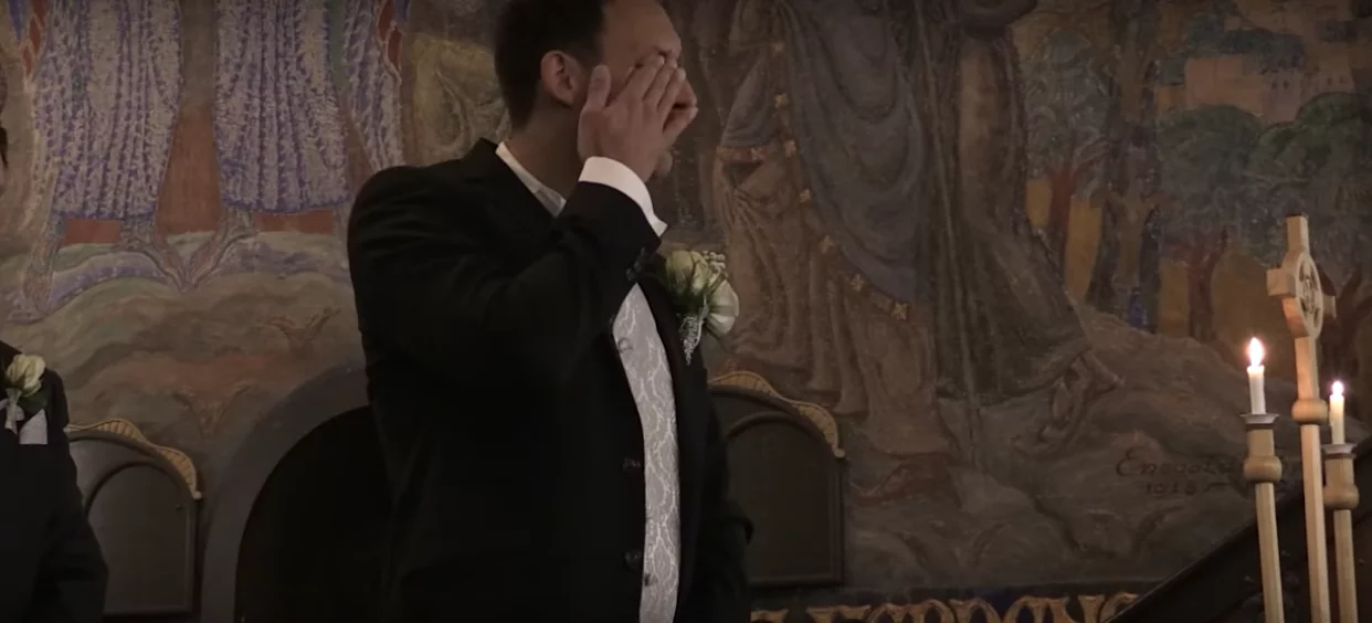Lo sposo, posto nella parte anteriore della chiesa, inizialmente fece un caldo sorriso. Ma presto i sentimenti e l'emozione presero il sopravvento e per lui fu impossibile per trattenere le lacrime.