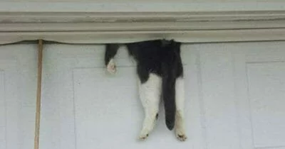 Vide la schiena di un gatto che pendeva dalla cima di una porta del garage e non riusciva a credere ai suoi occhi. C'erano già diversi vicini e operai edili che cercavano di aiutarlo.