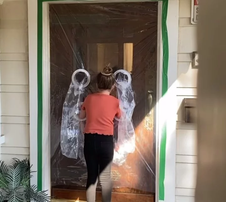 La bambina non ha fatto altro che isolare la porta di casa dei nonni con della plastica del e nastro, in cui poi aprì le proprie aperture con una copertura di plastica per far passare le mani sia dall'interno che dall'esterno.