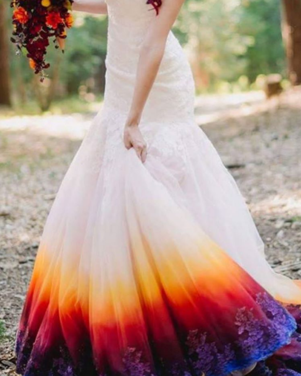 Se il bianco sembra troppo classico per il matrimonio ma non si è sicuri di voler osare completamente scegliendo un abito colorato, potreste seguire la tendenza del 2019: l'abito bianco con sfumature colorate sul fondo della gonna.