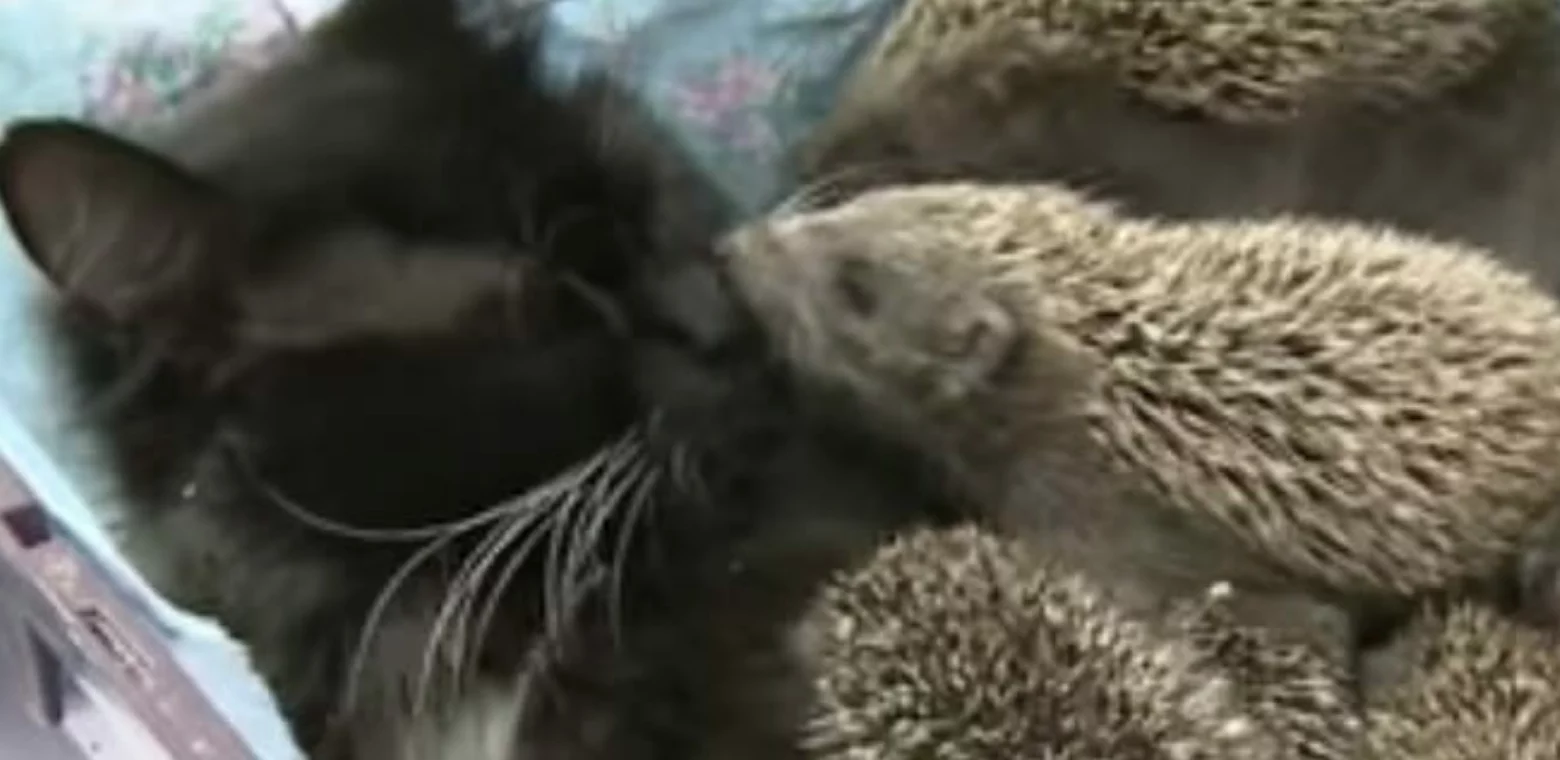 La gatta si sdraiò e i ricci sentirono l'odore del latte e presero dopo pochi secondi il latte dalla loro nuova mamma adottiva.