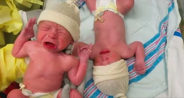 I bambini piangono nervosamente, ma poi succede qualcosa di straordinario: uno staff dell'ospedale li guida delicatamente insieme. La loro reazione è tanto istantanea quanto miracolosa.