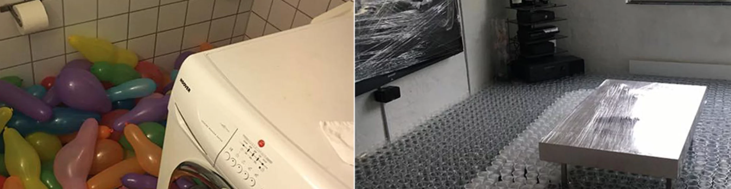 I suoi amici avevano riempito l'intera abitazione con bicchieri d'acqua riempiti e palloncini gonfiati.