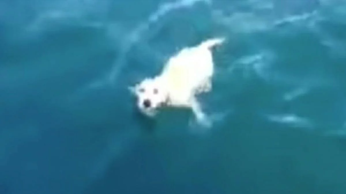 Il cane era completamente esausto e gravemente congelato dopo aver nuotato a lungo senza speranza nel mezzo del mare aperto.