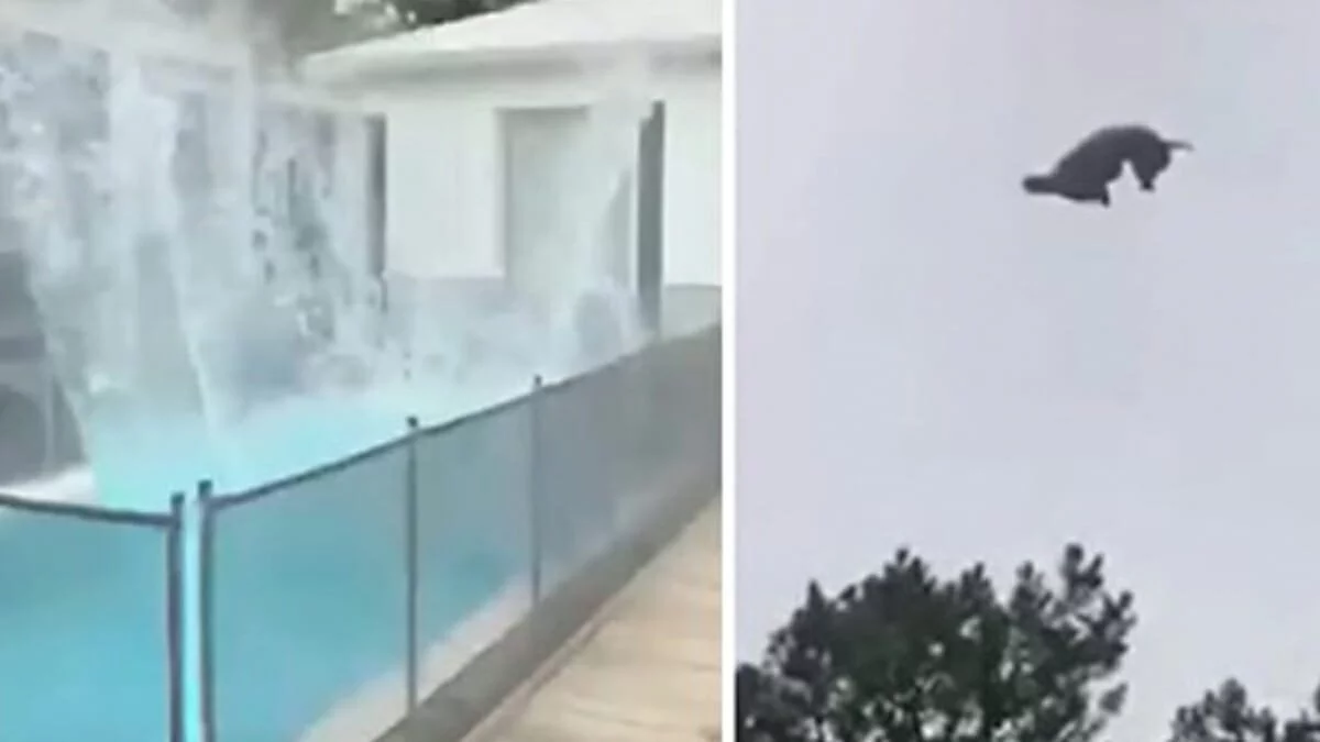 In un video girato in Uruguay, in Sud America, puoi vedere come un elicottero sale molto in alto nell'aria. Sorprendentemente, un maiale viene lanciato dal velivolo - che cade direttamente nella piscina sottostante.