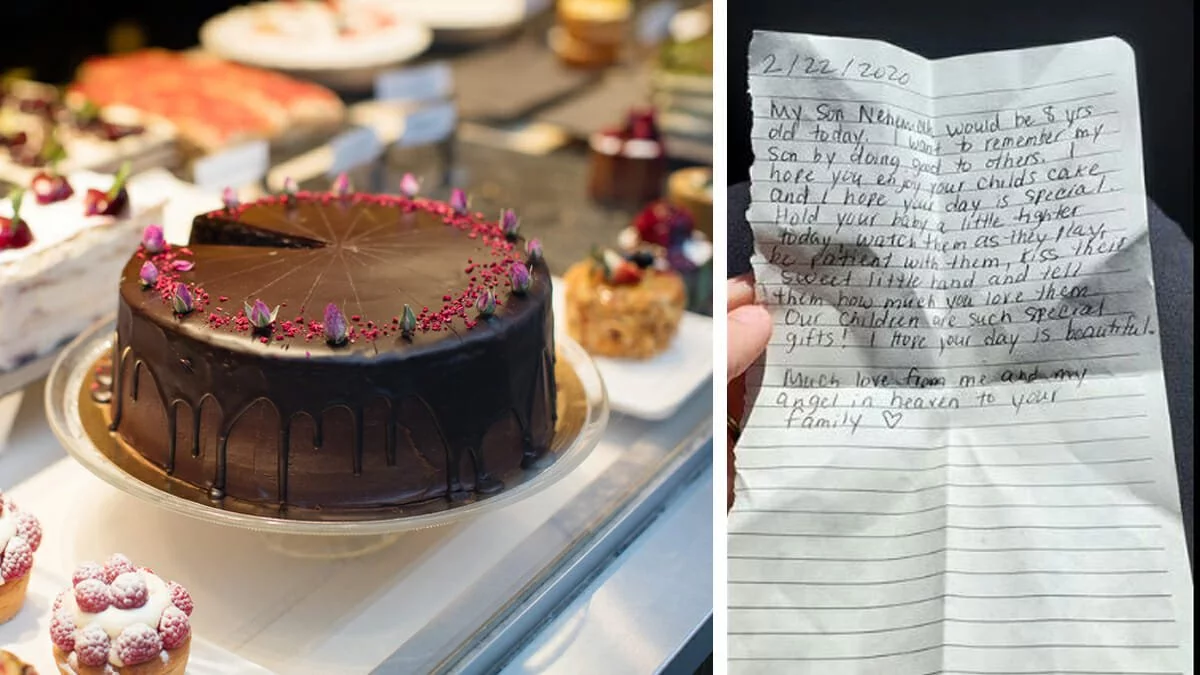 Il pasticcere disse alla madre che uno dei clienti aveva già pagato l'intero conto. La donna che aveva pagato il conto aveva lasciato un messaggio scritto a mano rivolto a lei.